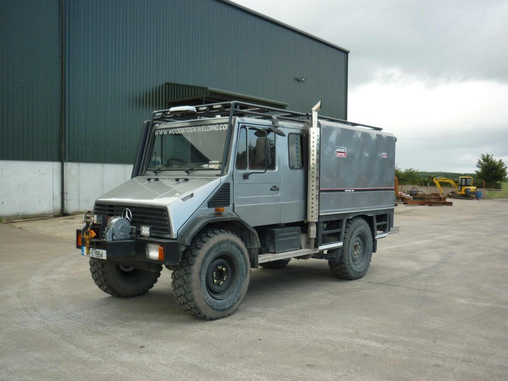 This has been converted in to a mobile welding rig it is only one of a kind with a lot of extras , it would make an ideal expedition vehicle ,it is fitted with a hydraulic operated hood which rises and retracts to gain access with a hydraulic operated back step also which folds up underneath body to maintain ground clearance at all times .It has a winch fitted to the front which can be operated from the cab or the control can be pluged out and pluged in at a location in the front bumper if need be. It has three seats in cab with the drivers and passengers been fitted with air seats for maximum comfort .It has a tow hitch which can be attached when need be and taken off when not with the aid of just one pin.stainless steel ladder to gain access to roof rack.This unimog was fully refurbished with all new brakes ,suspension uprated with two sets of rear back coil springs to carry extra weight ,all oils in diffs ,axels , gear box and transfer boxes changed , full under body spray and body spray in metallic grey.